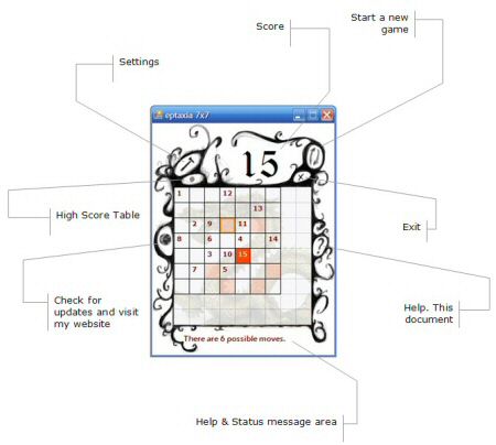 The game consists of one main screen and a settings form. The figure here explains all the functions of the buttons.